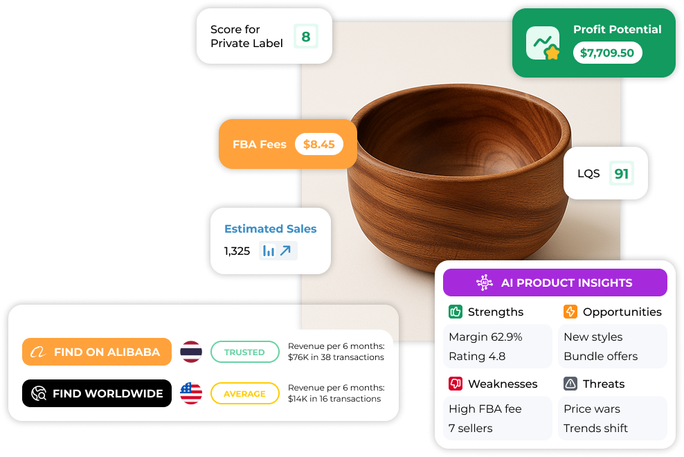 PRO AI ExtensionFind and verify profitable products using AI, and see if they are trending upward or downward. Check competition levels, discover sourcing options, and improve the quality of your listing.